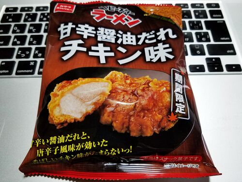 先日「ベビースター 甘辛醤油だれチキン味」をゲットしました。 ベビースターの「あのマスコット」の、子供むけを思わせるパッケージではなくて、どちらかというと大人向けなのでしょうか。 黒や濃いめの赤を中心とした、重厚感あるデザインでした。 チキン…